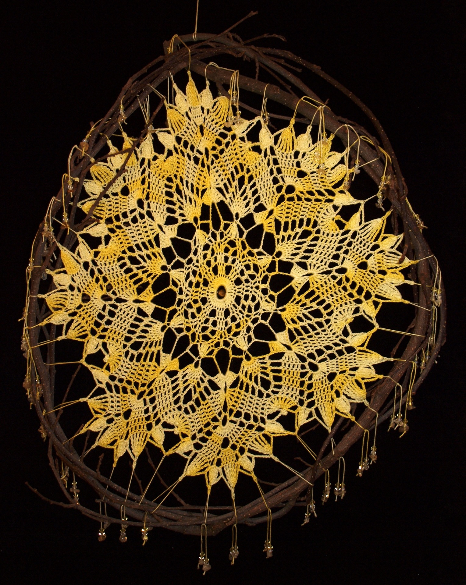 Závěsná dekorace háčkovaná ze žluté melírované příze, je zdobena drahými kameny Citrín, Tygří oko. Vypnutá je v rámečku z olše.